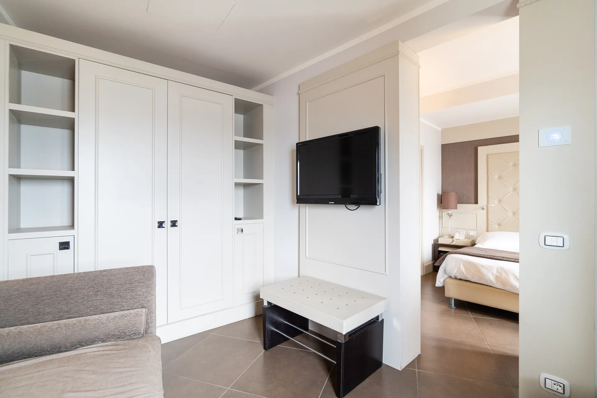 Con i suoi 24 mq di superficie, è composta da una camera matrimoniale con letto queen size e da un ampio salotto con divano, ideale per momenti di relax in un ambiente curato nei minimi dettagli.