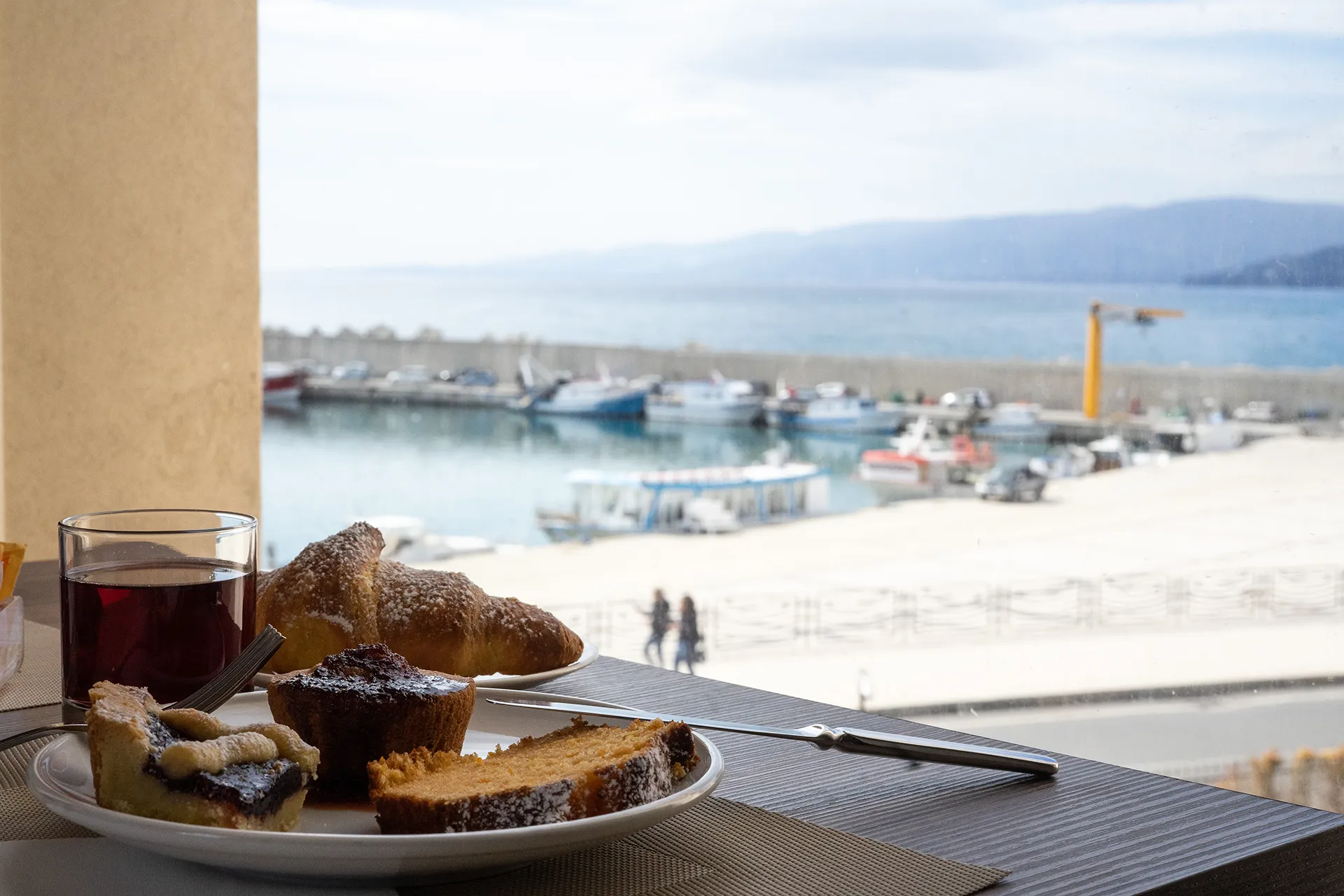 La prima colazione del Best Western Plus Hotel Perla del Porto, servita nella dedicata sala Egeo al primo piano, è composta da angolo dolce, angolo salato, angolo beverage e angolo della frutta.